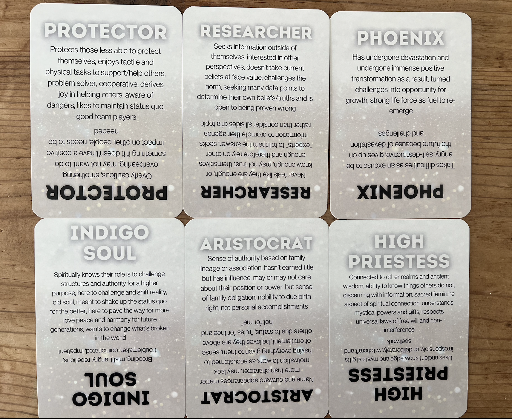 Each of the 73 archetypes represented in this deck include standard as well as more multi-dimensional archetypes intended to be representative of those on an ascension journey. Each card details both the light and the shadow aspects of each archetype, and are intended to help provide insight into the characteristics most relevant to the querent’s situation.